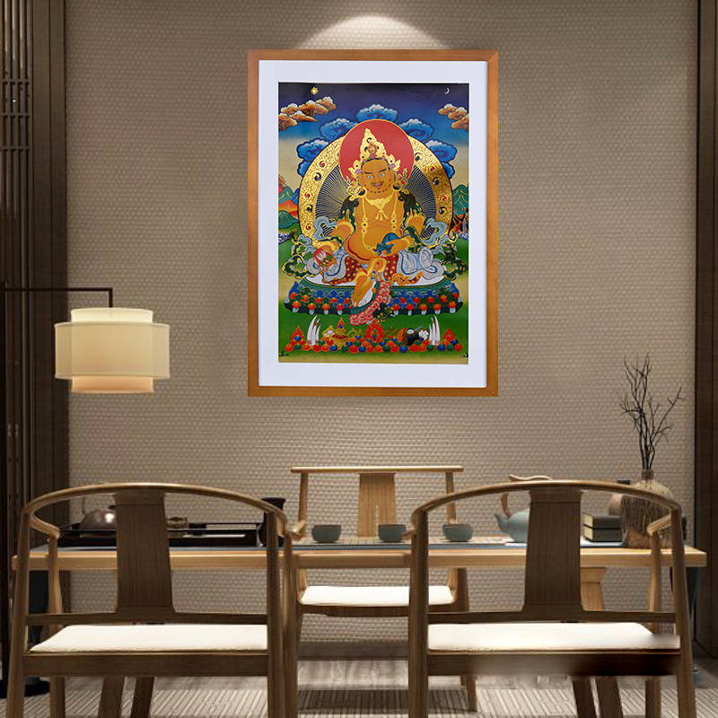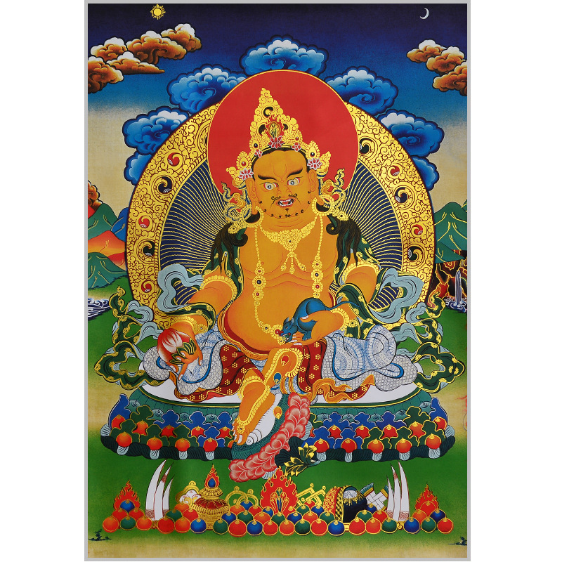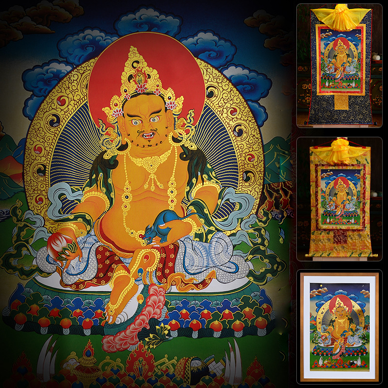 Gilded Yellow Jambhala Thangka | Tibetan Five Lineages Wealth Gods Buddhist Wall Art for Entrance & Home Decor