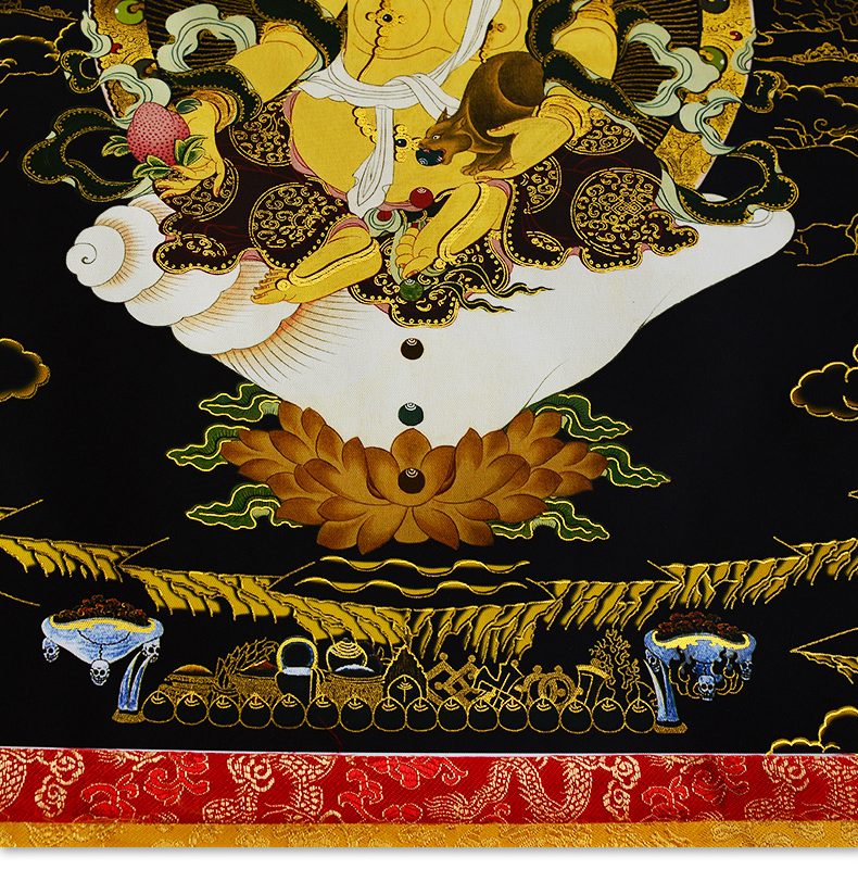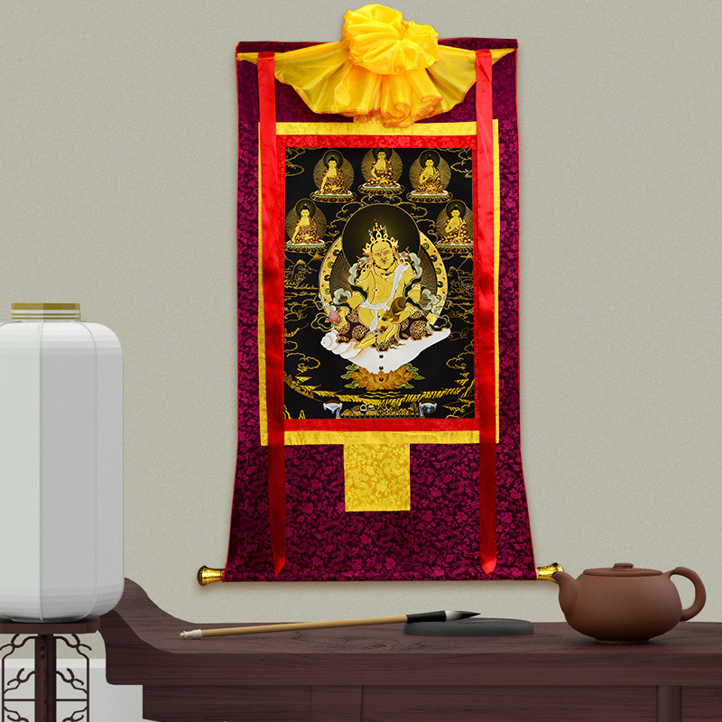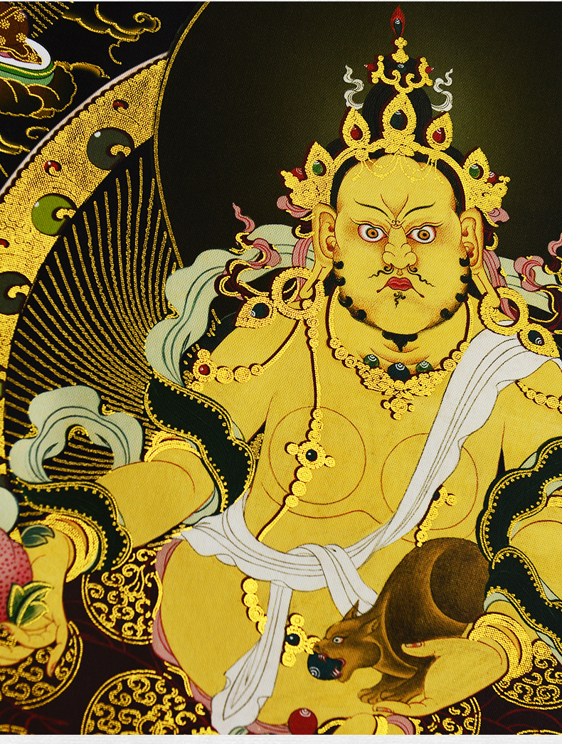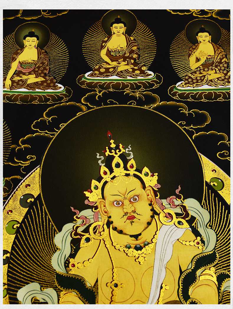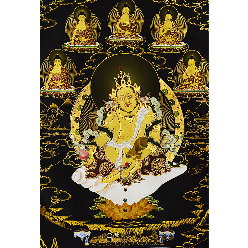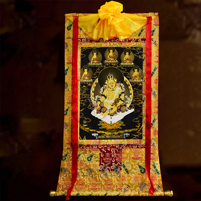 Gilded Yellow Jambhala Thangka | Tibetan Five Wealth Gods Buddhist Wall Art for Entrance & Altar Decor