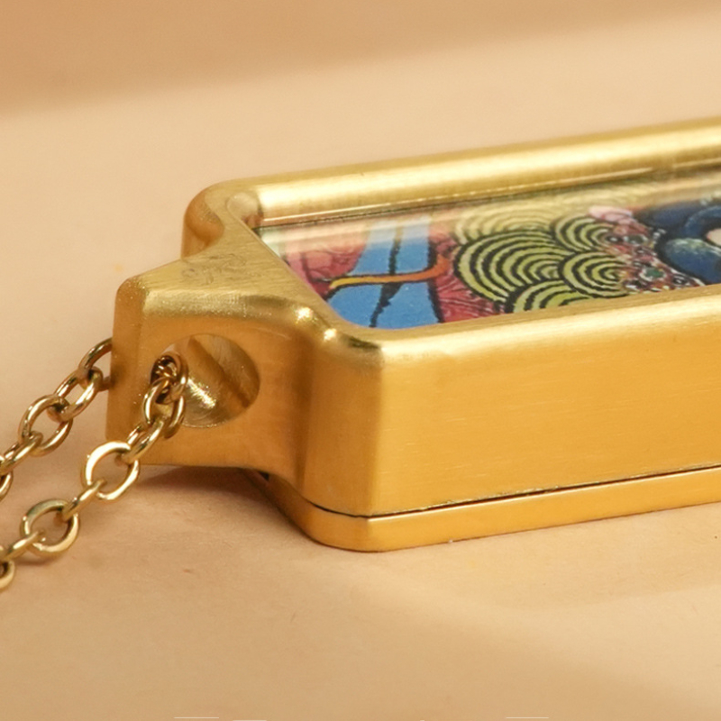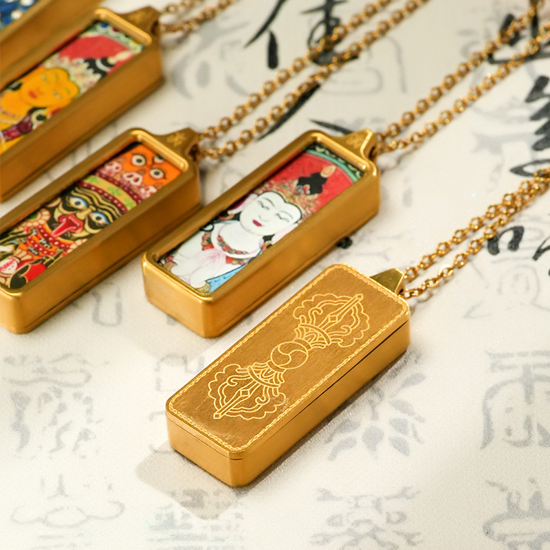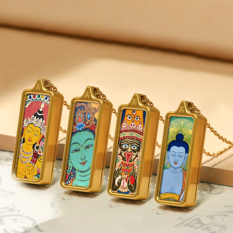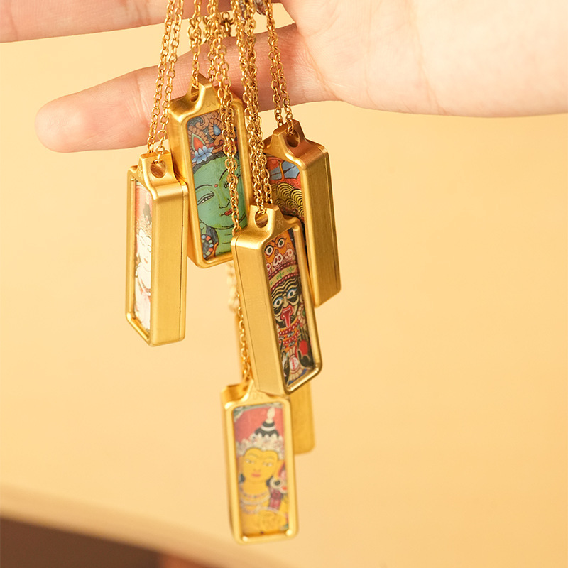 This mini thangka pendant collection features intricate Tibetan Buddhist deities, including Yellow Dzambhala, Black Mahakala, Medicine Buddha, Green Tara, and Tseringma. Crafted from titanium steel with a gold-plated finish, each piece combines durability with a refined classical aesthetic.