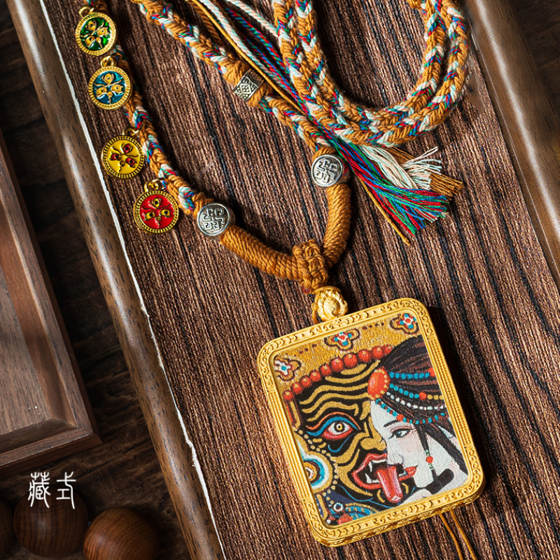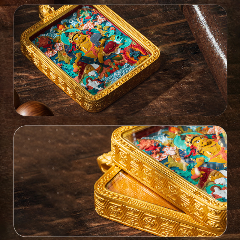 This is a handcrafted gilded Thangka pendant that embodies devotion and artistry. Framed in traditional brass, it features a meticulously hand-painted miniature Thangka on cloth, enhanced with professional gilding using pure gold or gold powder to make the deities radiant with exquisite details. More than a beautiful accessory, it is a portable shrine you can carry with reverence, keeping the blessings of sacred wisdom and peace always close to your heart.