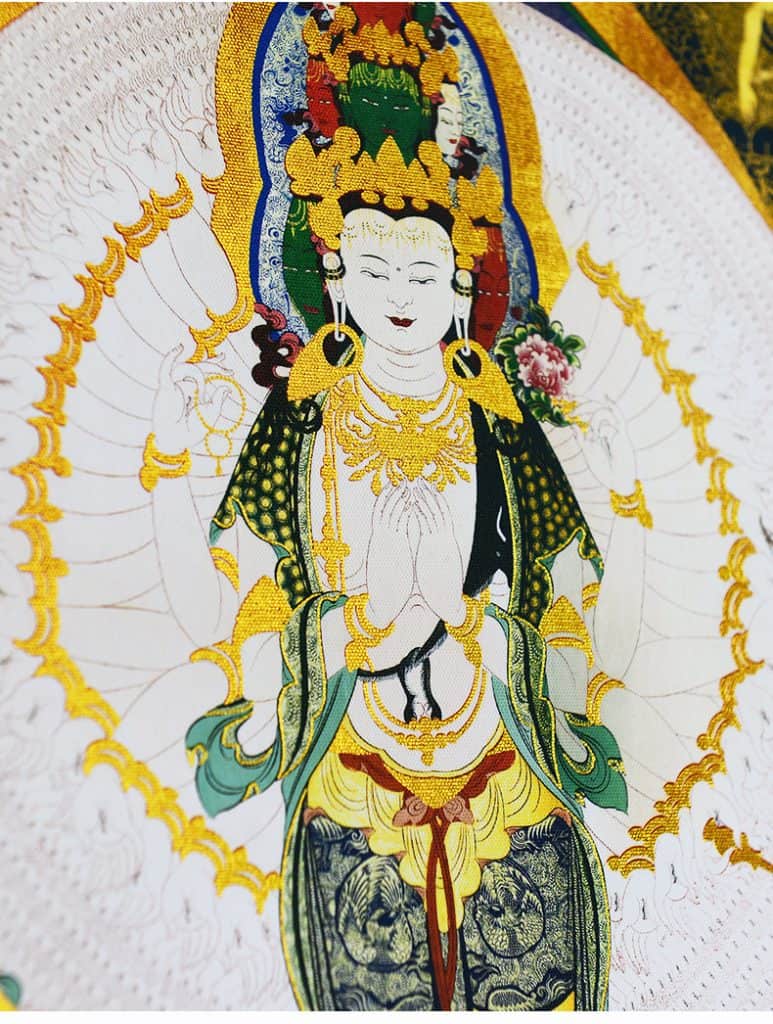 Avalokiteshvara thangka symbols share the spiritual qualities, gestures, and colors of the bodhisattva of empathy.